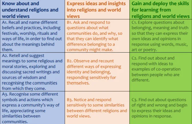 We follow the Rotherham Agreed Syllabus, using RE today unit to enourage creative thinking and expression.